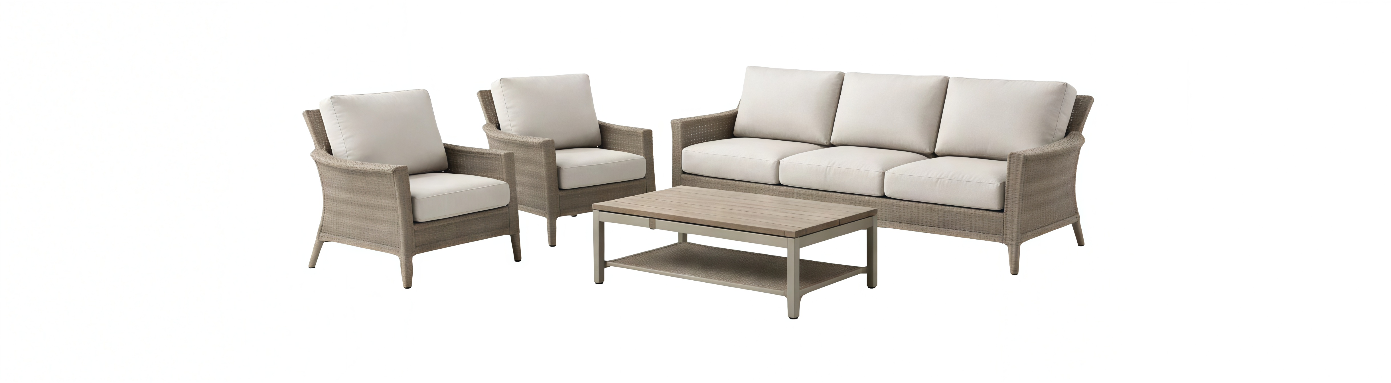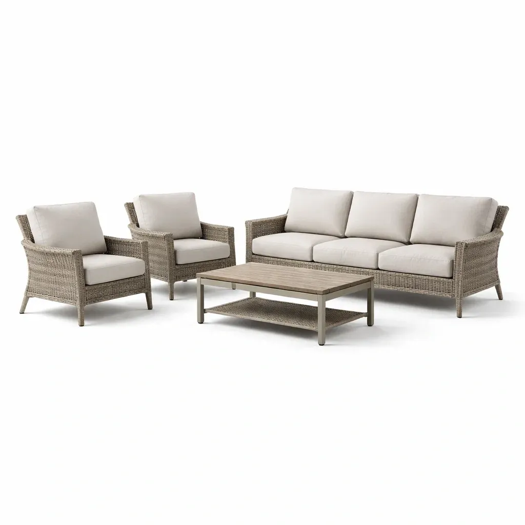 Set di divani da esterno in rattan sintetico beige con tavolino in alluminio e legno composito