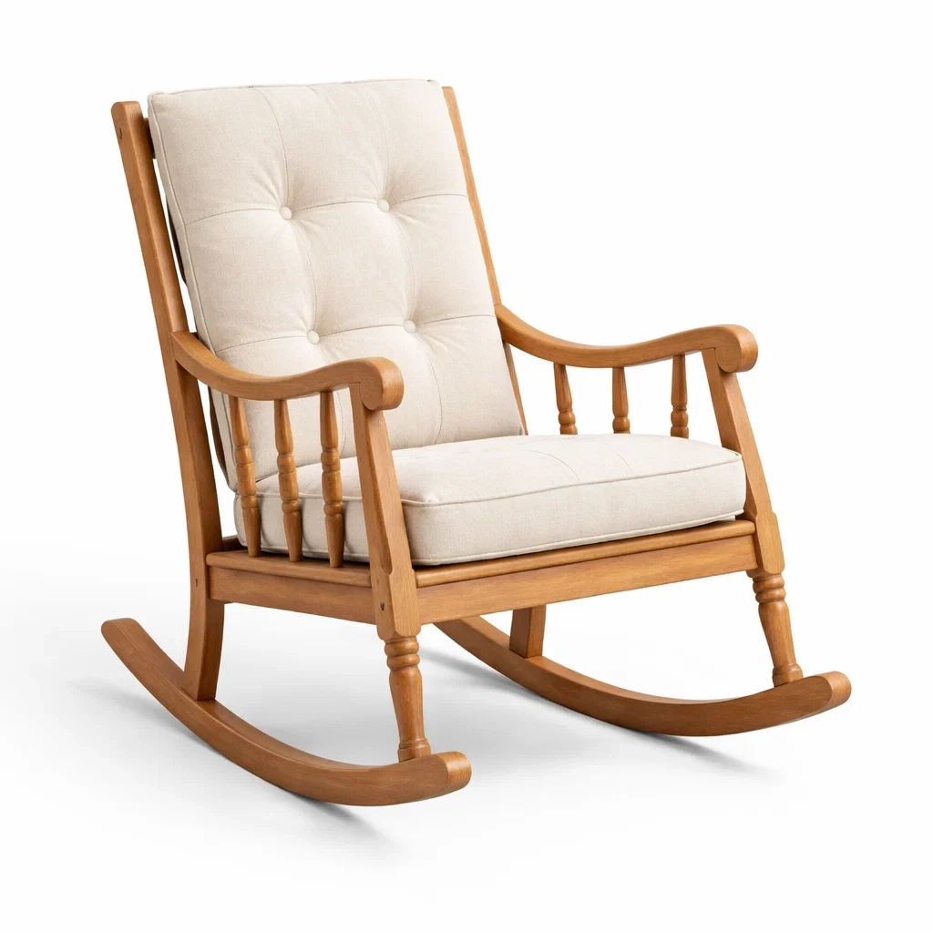 Sedia a dondolo in legno con cuscini in poliestere beige