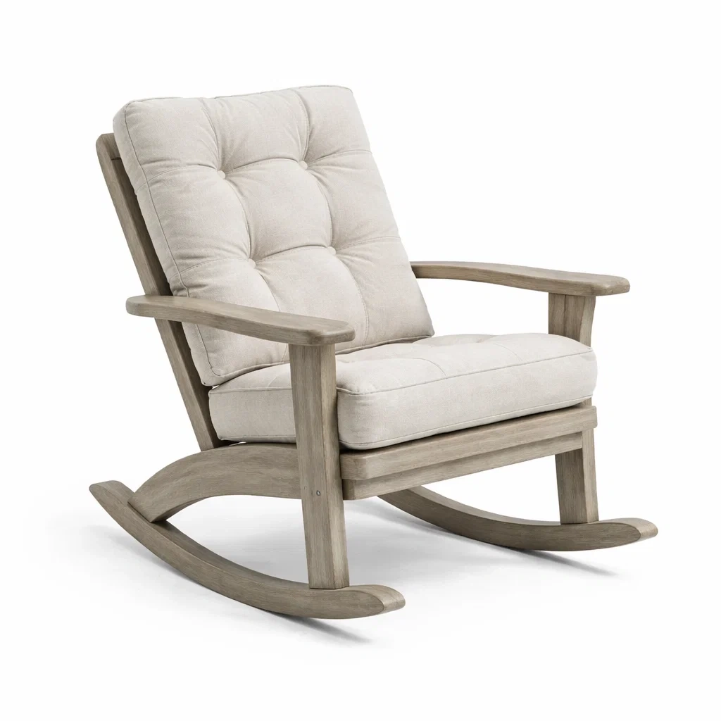 Sedia a dondolo in legno con rivestimento in tessuto di cotone beige