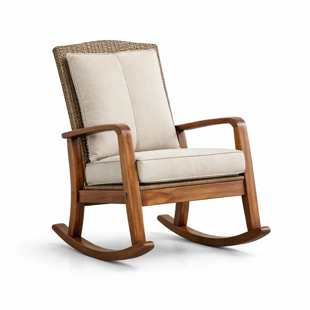 Sedia a dondolo in legno con schienale in rattan e cuscini beige