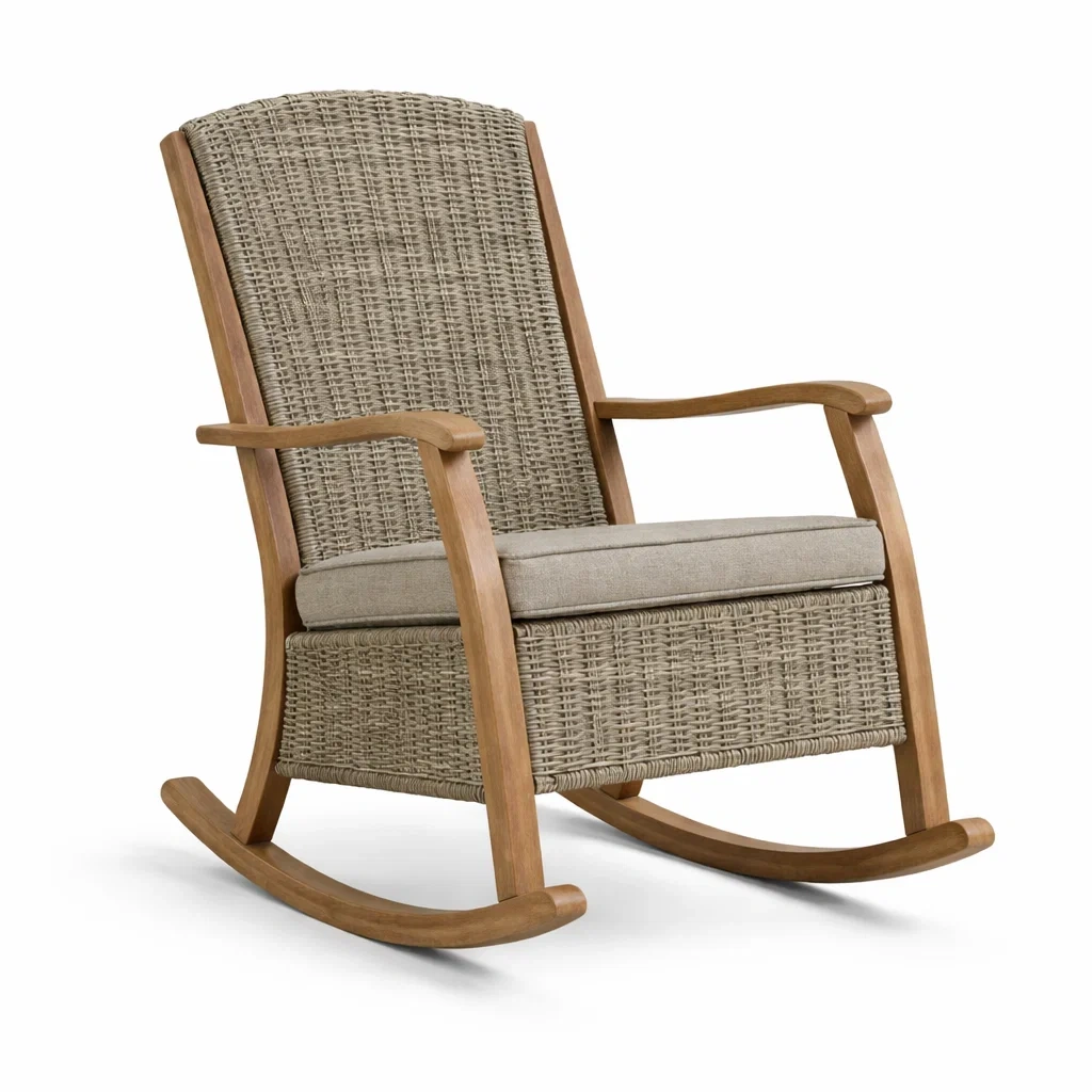 Sedia a dondolo in legno e rattan con cuscino in poliestere