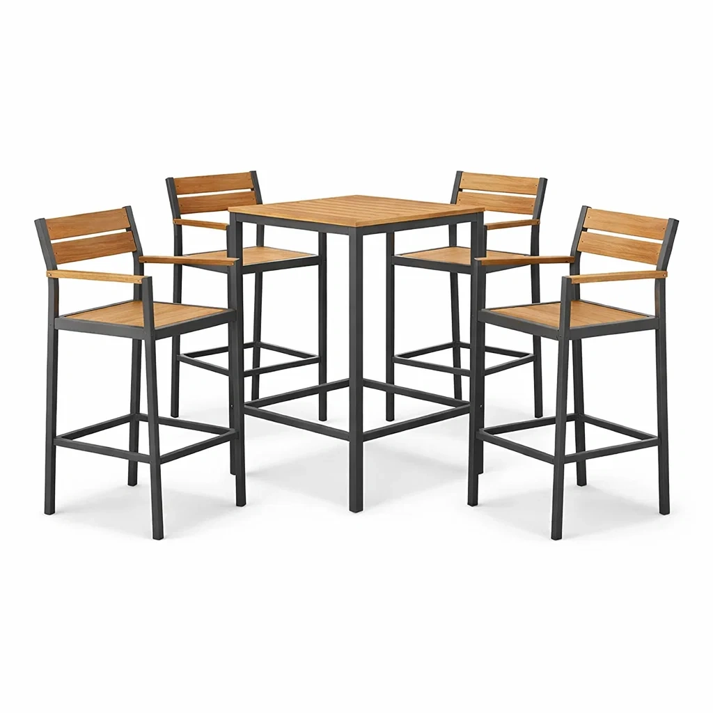 Set bar in acciaio e legno di acacia con tavolo e sedie