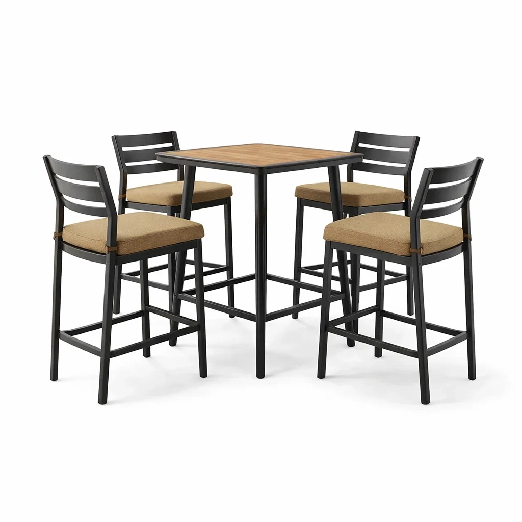 Set bar tavolo quadrato in legno e metallo con sgabelli imbottiti