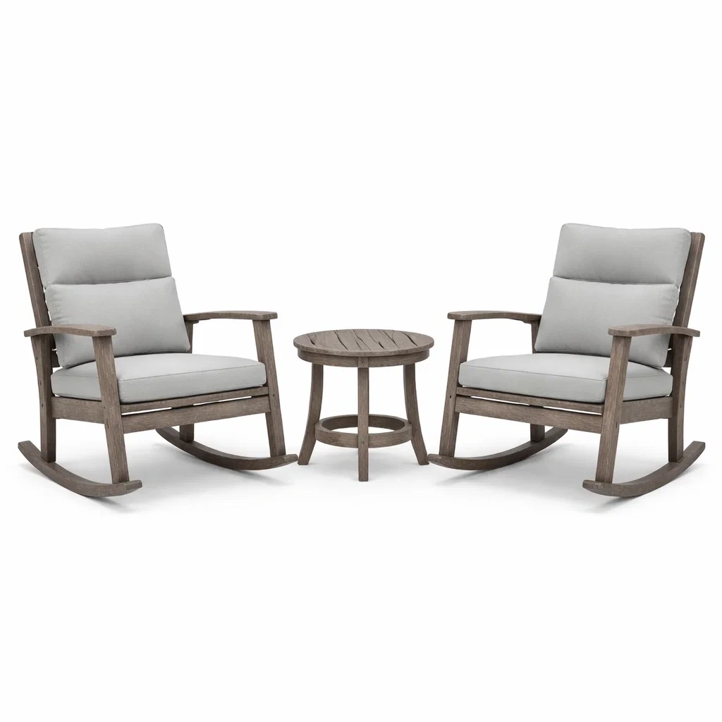 Set da relax piccolo con sedie a dondolo in legno e cuscini in poliestere con tavolino grigio