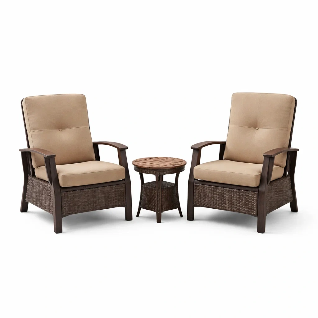 Set da relax piccolo con sedie e tavolo da esterno in rattan e metallo marrone con cuscini beige