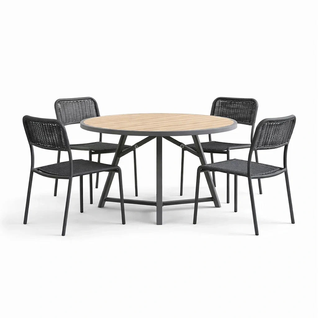 Set tavolo e sedie con tavolo rotondo e sedie in acciaio nero e legno